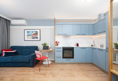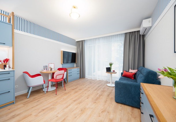 - salon z rozkładaną kanapą, która może pełnić funkcję dodatkowego miejsca do spania.